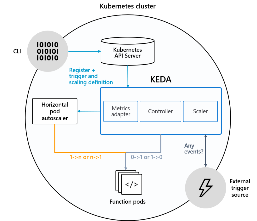 KEDA的架构如下图所示:从这个架构图,我们看到KEDA包含了3个组件,Metric Adapter给k8s的HPA提供度量指标让其进行1-n/n-1的伸缩,Controller控制Pod进行1-0/0-1的伸缩,Scaler侦听配置的触发器所触发的事件。