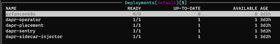 这个时候应该可以看到k8s出现了名为azfunconk8s的Deployment,且需要实例和运行实例数都是为0: