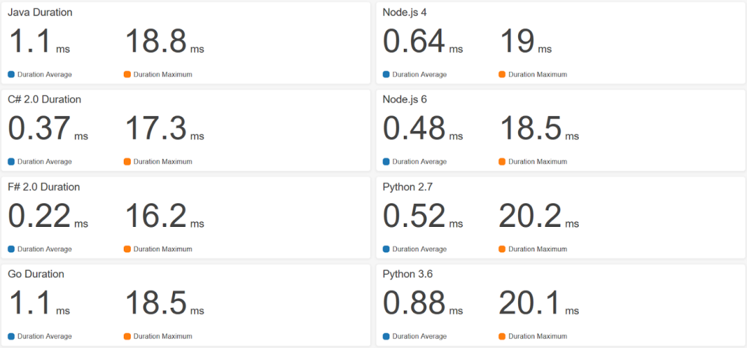 同时,我们采用C#/.NET Core来作为函数的开发语言。为什么用这个选择,是因为有第三方对AWS Lambda上的支持的语言进行了性能测试,得到的结论是.NET Core的C#和F#语言性能最高:来源:https://read.acloud.guru/comparing-aws-lambda-performance-of-node-js-python-java-c-and-go-29c1163c2581