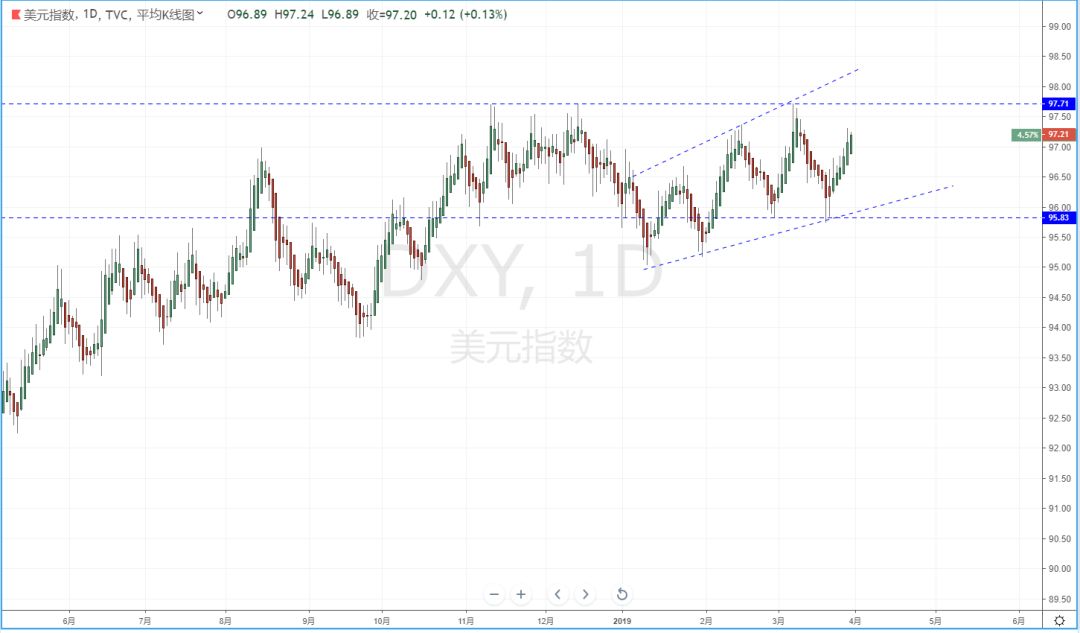 美元指数天图:目前整体趋势继续在反弹阶段,短期李上方水平压制较近。现阶段趋势属于在上行通道中,上方水平压制带在97.71附近。近期注意市场动能以及趋势在高位区间的风险。