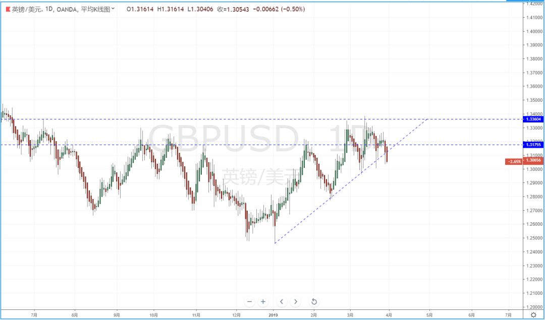 镑美天图:目前整体趋势在高位受阻,并且有跌破上升趋势线与水平压制带1.31755附近。上方短期头部状态形成后期可适当留意空头机会,下方目标位置参考1.29719附近。