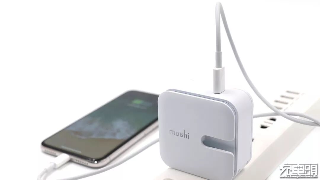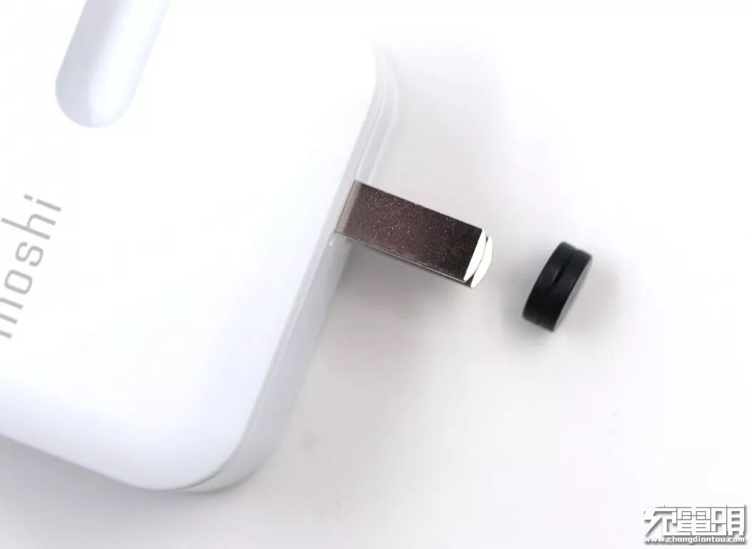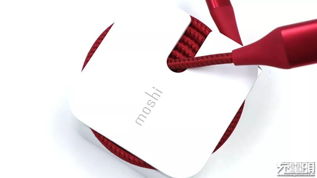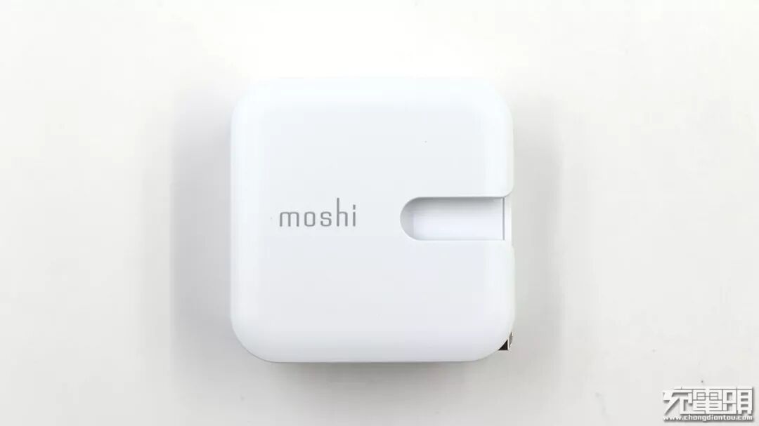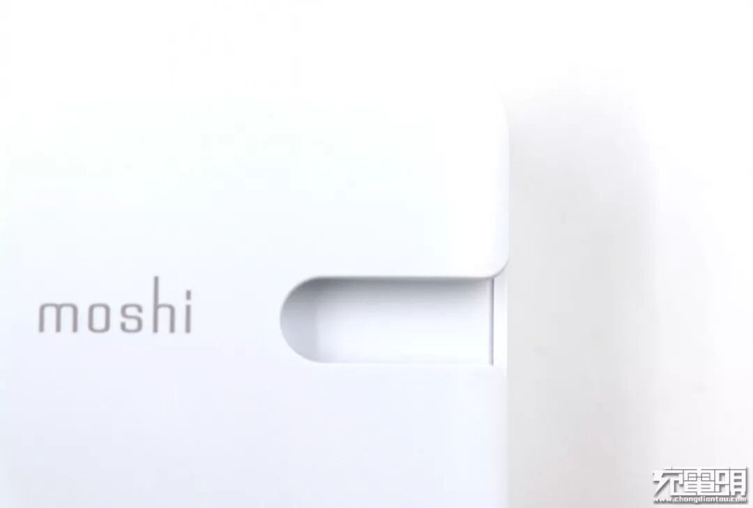 充电器正面,比较显眼的是moshi的品牌标志以及向右开口的凹槽。