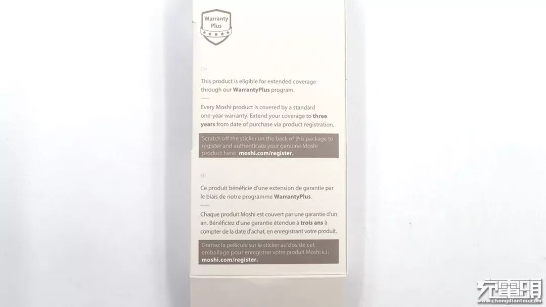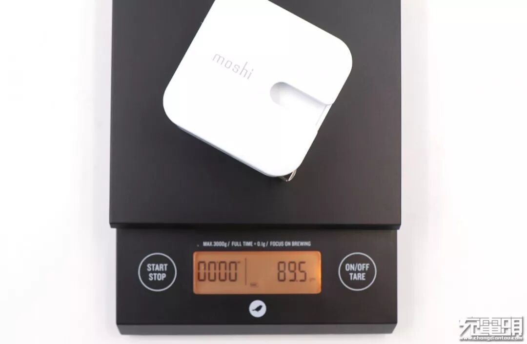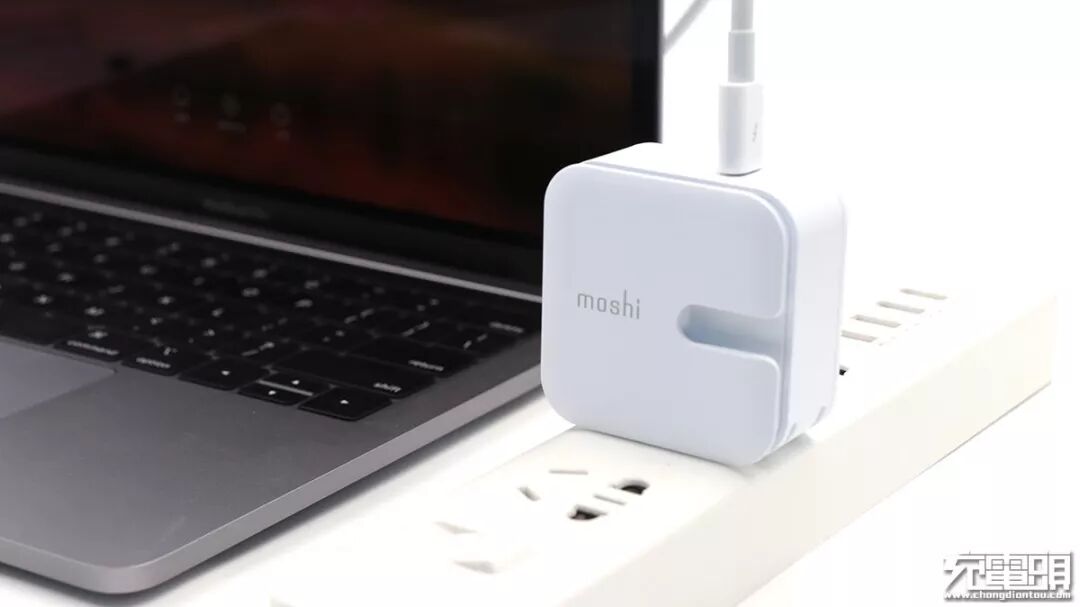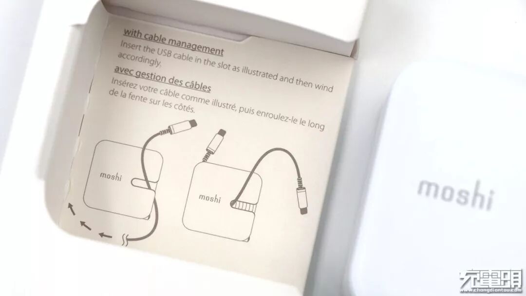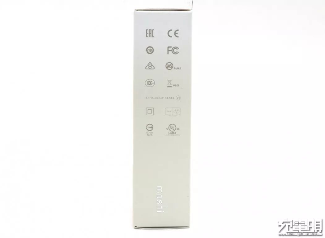 充电器正面,比较显眼的是moshi的品牌标志以及向右开口的凹槽。