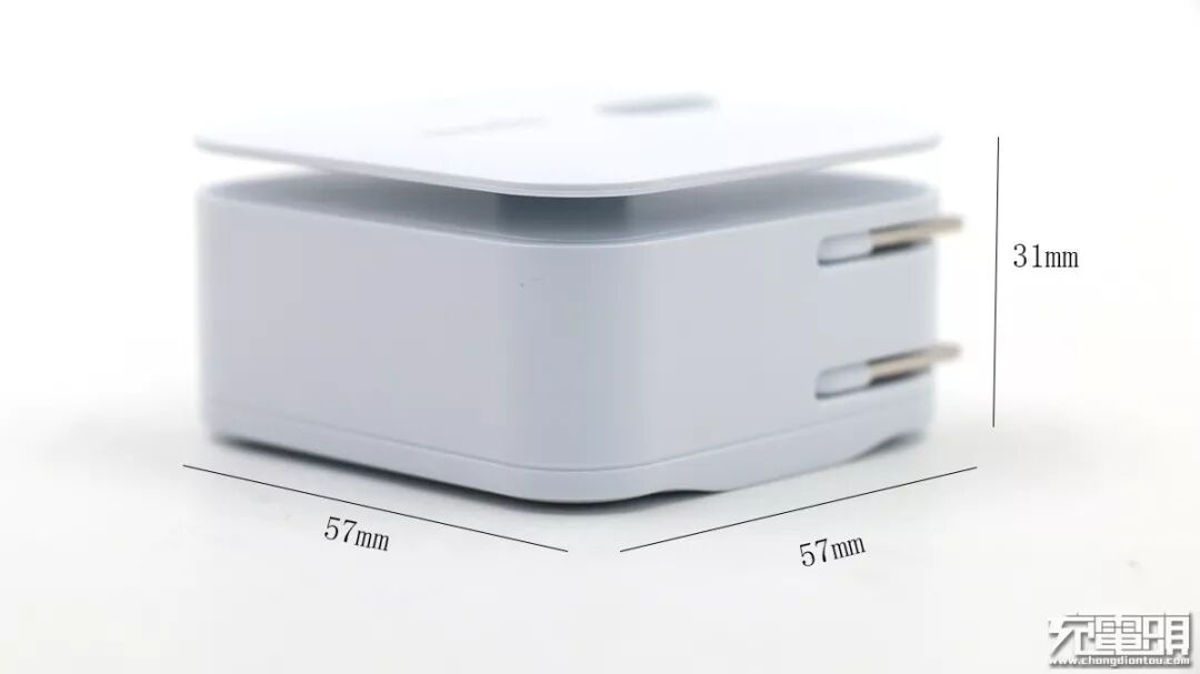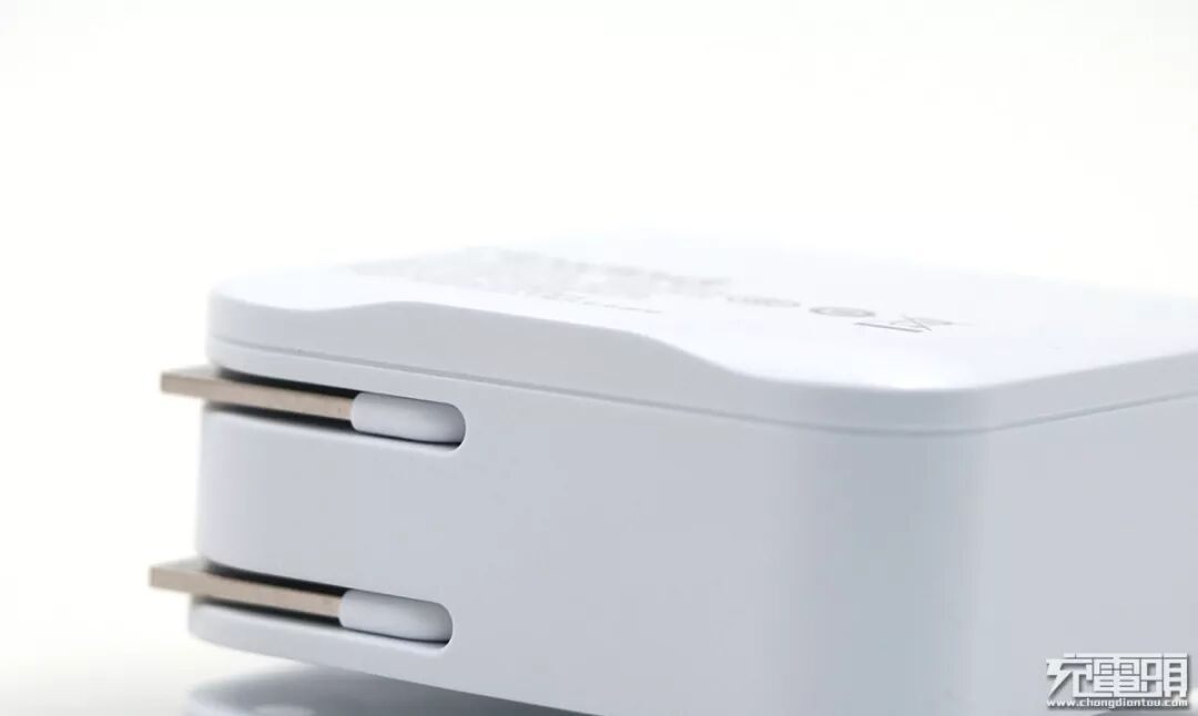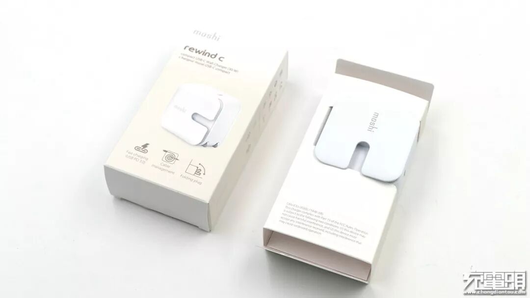 取出充电器,充电器卡在卡纸上,正面有一个凹槽,看多了四四方方的设计,摩仕这款充电器外观上给人耳目一新的感觉。