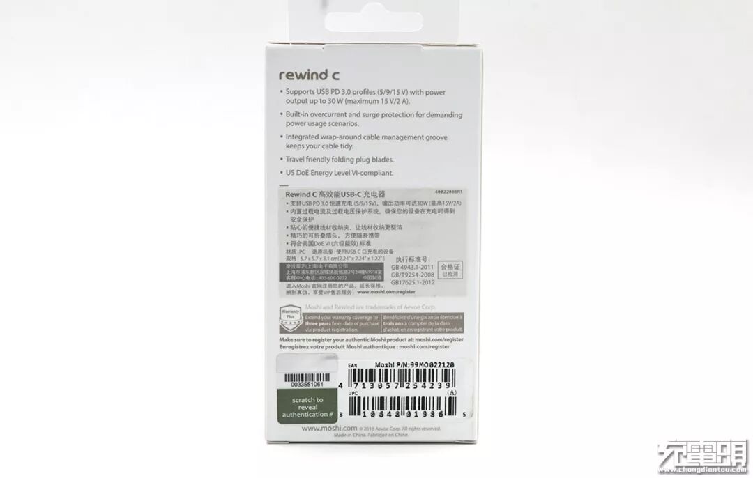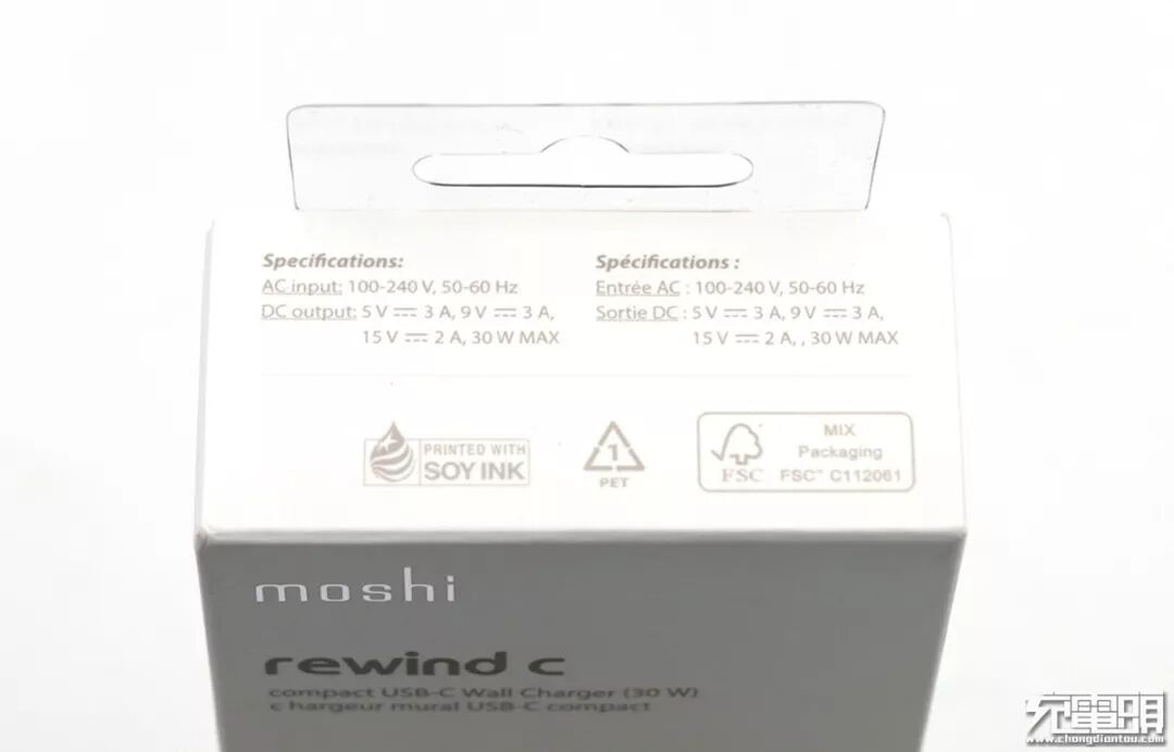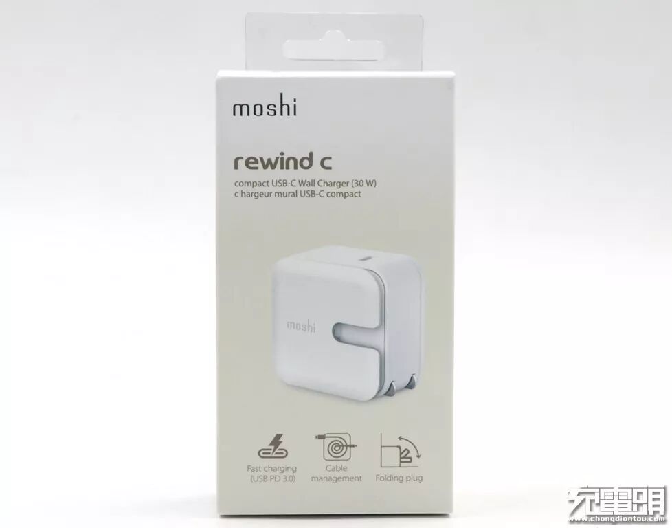 摩仕USB-C充电器采用卡纸覆哑膜外包装,logo处烫银处理。产品名称rewind c,英文“compact USB-C Wall Charger(30W)”意为体积小巧USB-C 30W墙充。正面产品照,下面是产品的特色:支持USB PD3.0快充、可绕电线、折叠插头。