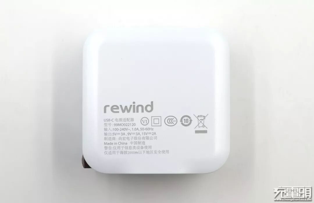 充电器背面标注输入输出参数:
