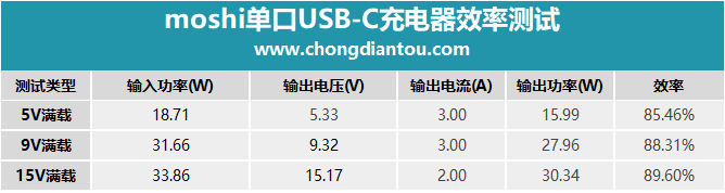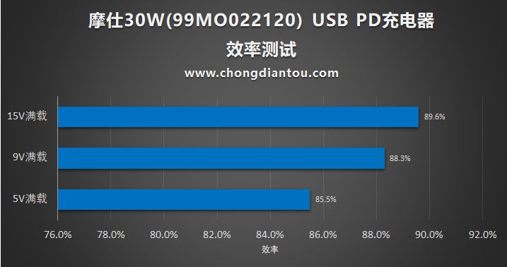 效率测试中,15V效率最高,为89.6%,9V满载时效率为88.3%,5V满载效率为85.5%。