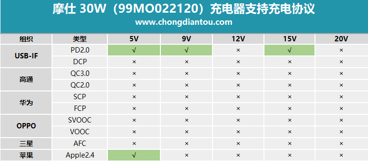 快充协议统计如上表所示,支持PD3.0以及Apple2.4A。