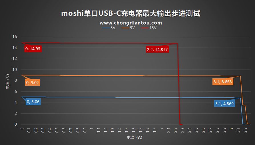 5V电压下,最大输出4.87/3.1A/15.1W;9V电压下,最大输出8.86/3.1A/27.4W;15V电压下,最大输出14.82/2.2A/32.6W。各档位实际最大输出要与标称值相差不大。