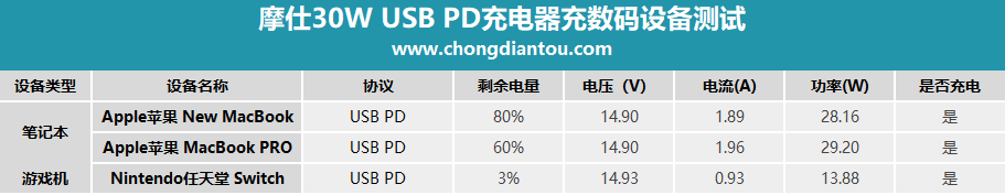 从测试来看,摩仕30W USB PD充电器优缺点如下: