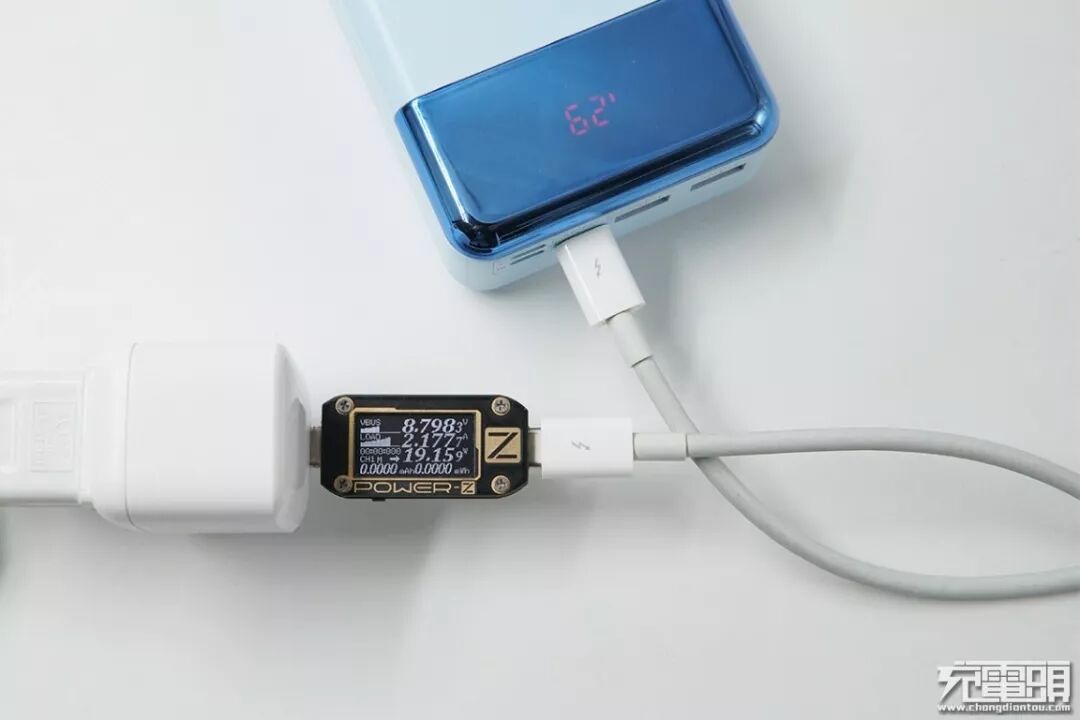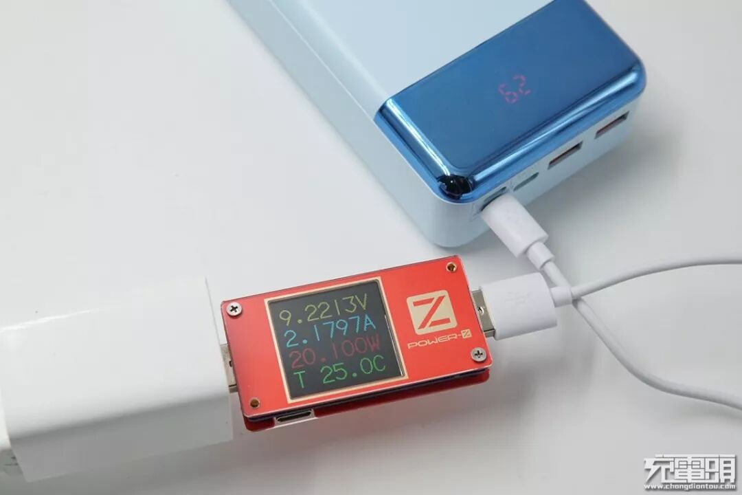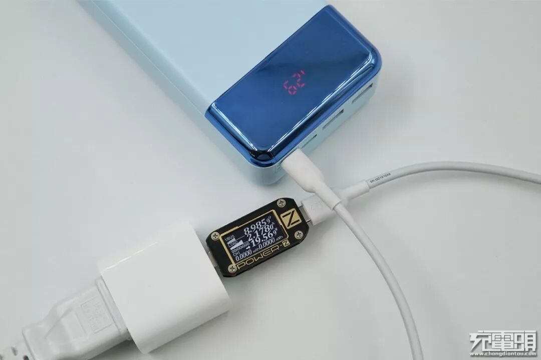 使用苹果18W PD充电器充羽博移动电源(Lightning口),电压8.98V,电流2.17A,功率19.56W,开启PD快充。