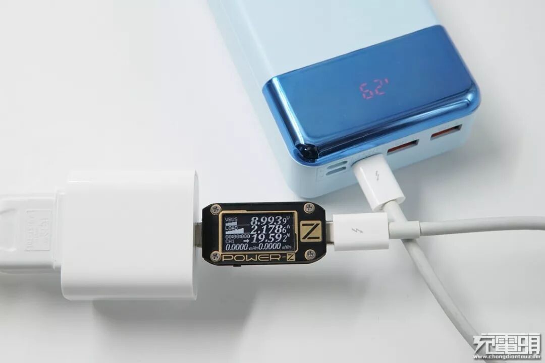 使用苹果18W PD充电器充羽博移动电源(USB-C口),电压8.99V,电流2.17A,功率19.59W,开启PD快充。