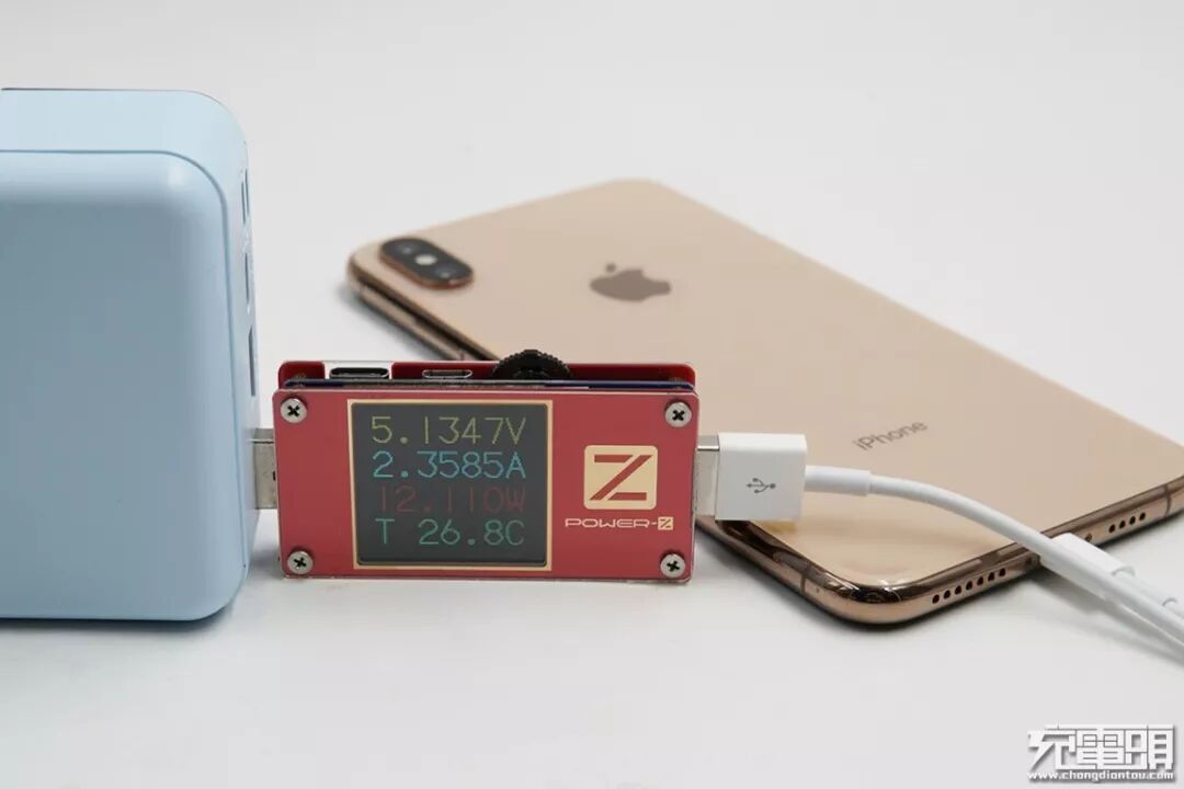 使用移动电源USB-A口给iPhone XS Max进行充电,KT001测试仪进行监测,当前电压为5.13V,电流为2.35A,功率12.11W,开启Apple 2.4A充电协议。