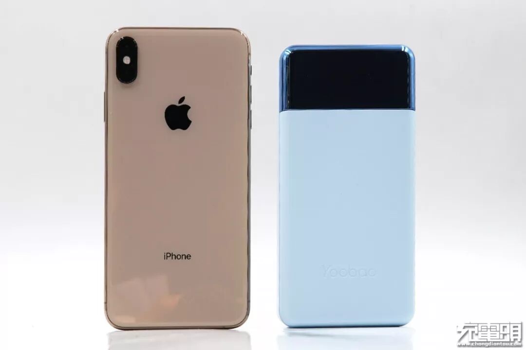 正面看尺寸比iPhone XS Max小一些,羽博30W-PD比市面上大多数30000mAh移动电源小很多。