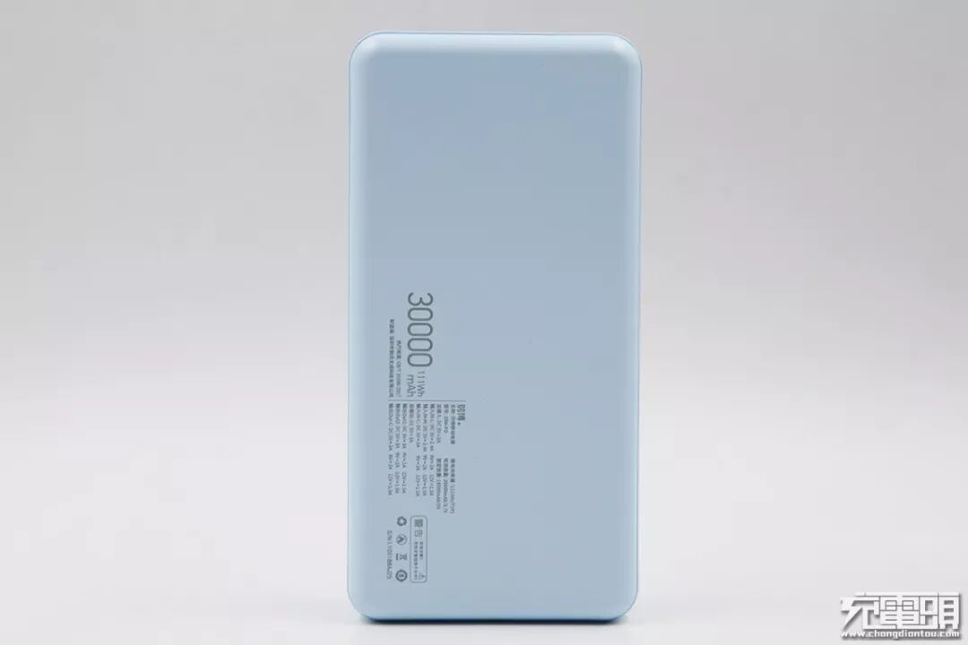 羽博30W-PD一共有白色、蓝色、黑色三款颜色,本次为大家带来的评测是蓝色款,看起来感觉有些高冷清新。移动电源外形为长方体PC材质,壳体上12条棱都有经过切角圆滑处理,不硌手为握持提供了良好的手感。