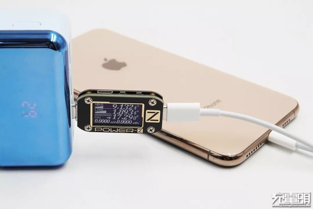 使用USB-C口给iPhone XS Max进行充电,ChargerLAB Power-Z KM001C测试仪进行监测,当前电压9.13V,电流1.89A,功率17.29W,开启PD快充。