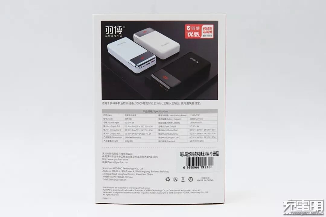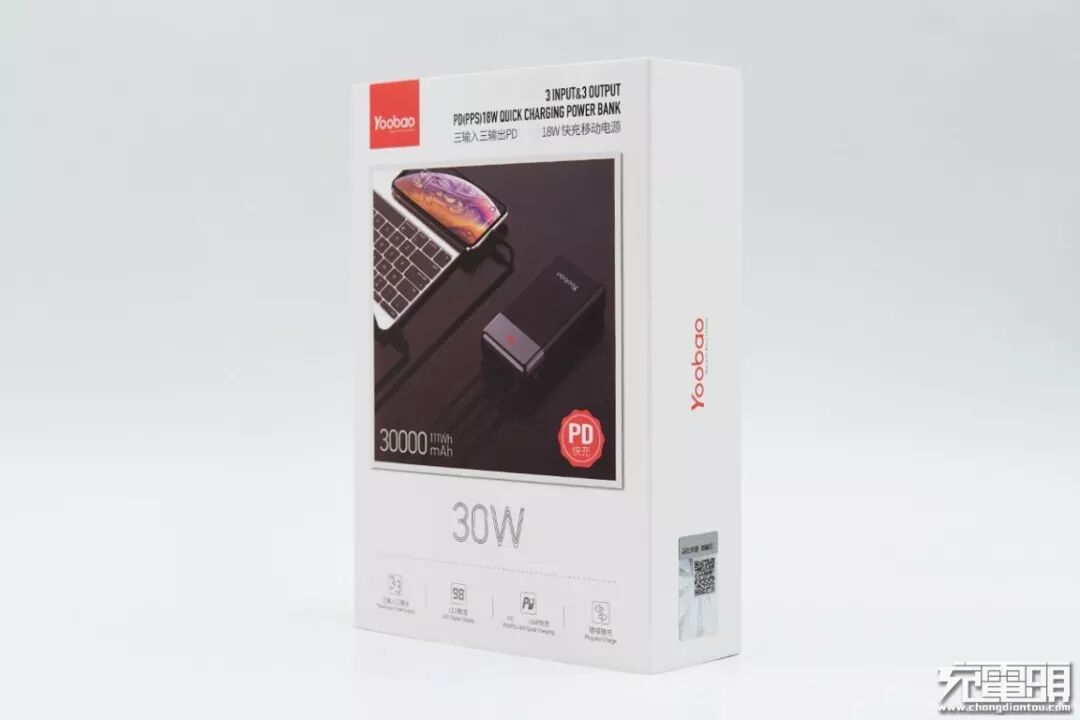 现在不用担心了,羽博推出了一款30000mAh大容量且支持PD快充的移动电源,型号是30W-PD,更让人值得关注的是它还有一个Lightning输入接口,同样支持PD快充,苹果用户再也不用为移动电源备一根安卓数据线了。今天要给大家带来的就是羽博30W-PD移动电源的评测。