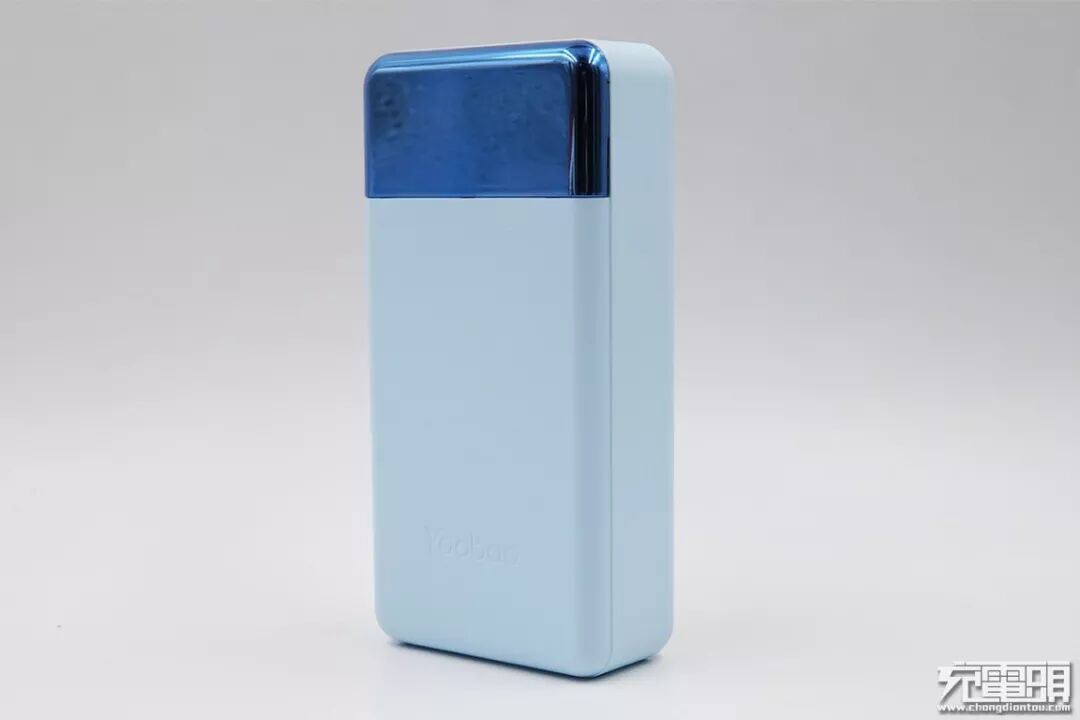 正面下方凹印有羽博Logo:”Yoobao”,上方深蓝色部分为移动电源的数显屏。