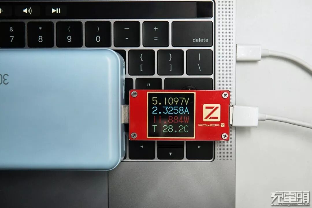 让人惊奇的是移动电源USB-A口居然还可以给MacBook笔记本电脑(升降压输入类型的笔记本)充电,当前是给MacBook充电,电压5.1V,电流2.32A,功率11.88W。功率相对于电脑来说功率虽然较小,但还是能起到一定的延缓续航时间的作用。