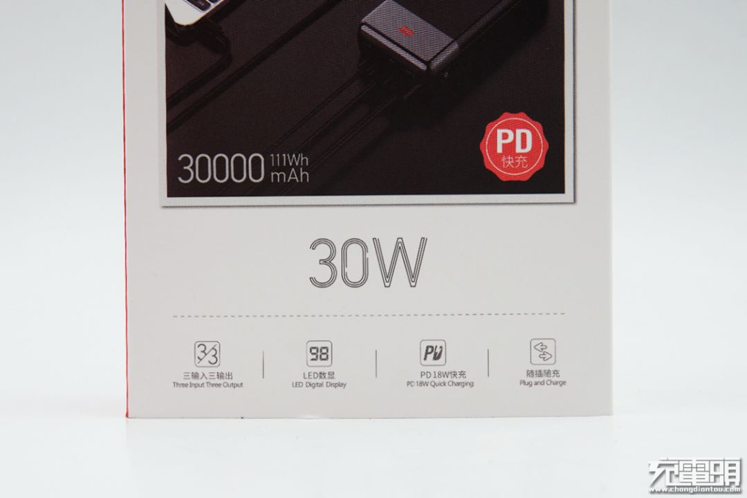 包装盒正面印制使用场景(可充手机与笔记本电脑)、产品名称(三输入三输出PD 18W快充移动电源)、产品容量(30000mAh)以及产品主要特点。