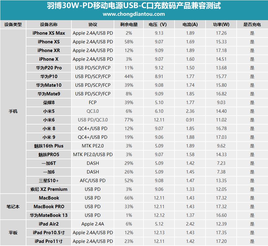 小编还测试了其他设备,做成表格方便大家观看。从图表中可以看出来,支持PD快充的数码产品均能跟羽博移动电源握手PD协议,开启PD快充。一些不支持PD的设备也能正常充电。