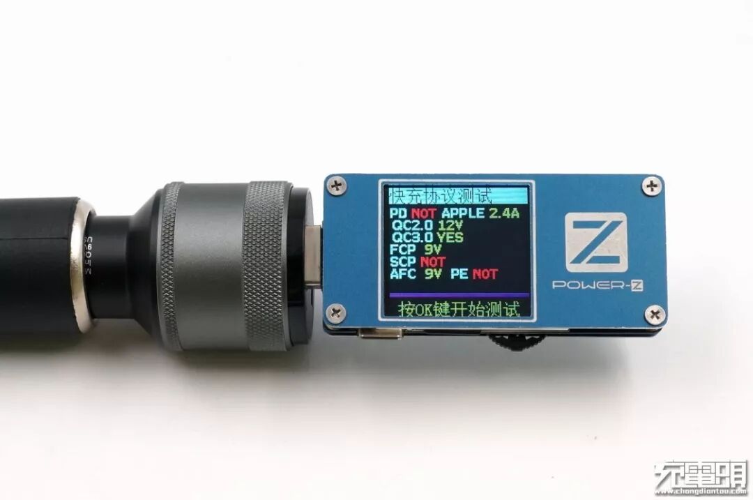 使用ChargerLAB推出的POWER-Z FL001S USB测试仪,测试先科蓝牙播放器橙色输出口支持协议,屏幕上显示支持的协议有:APPLE2.4A、QC2.0、QC3.0、FCP、AFC。
