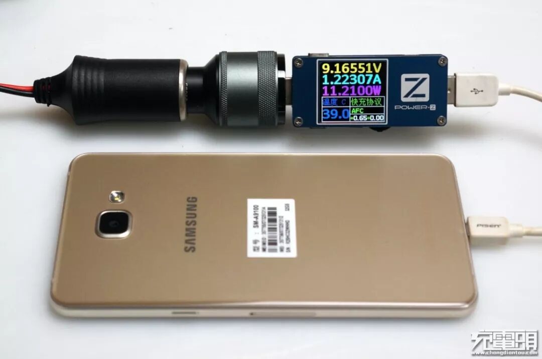 QC3.0输出口对三星A9100充电,成功握手AFC协议,功率:9.16V / 1.22A / 11.21W。