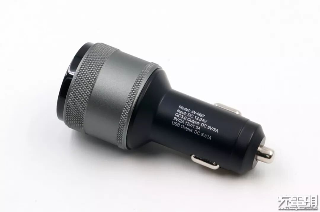 另一面产品信息部分,型号:AY-M97、输入:DC 12-24V、QC3.0输出:5V3A / 9V2A / 12V1.5A、输出:5V1A。