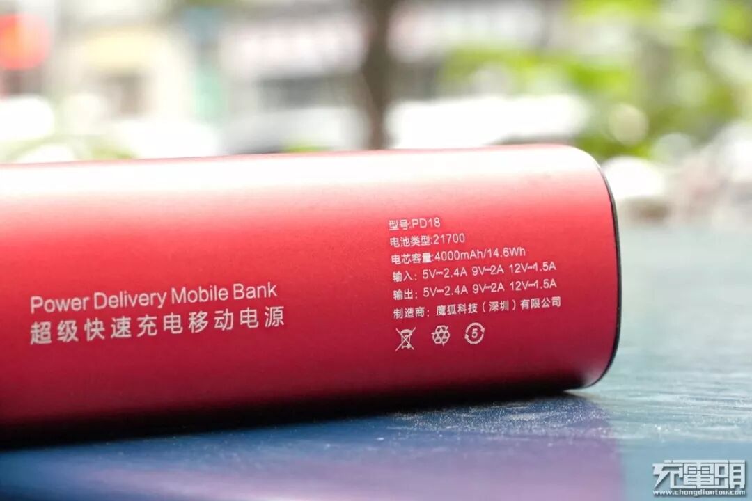 背面是产品的名称:超级快速充电移动电源,型号为PD18。与常见的18650电芯移动电源不同,这款移动电源采用的是21700电芯,电芯容量可以达到4000mAh即14.6Wh。输入输出分别支持5V/2.4A、9V/2A、12V/1.5A。由魔狐科技(深圳)有限公司制造。