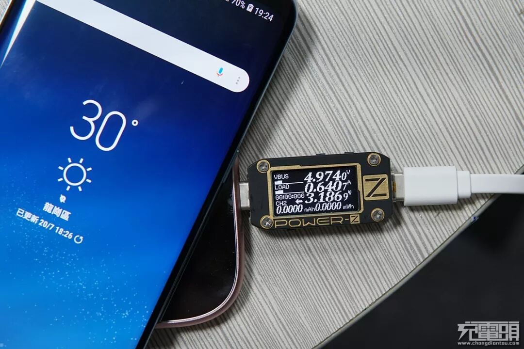 在给三星S8充电时,使用ChargerLAB POWER-Z KM001C测得无线充当前输入功率为3.18W(4.97V/0.64A)。