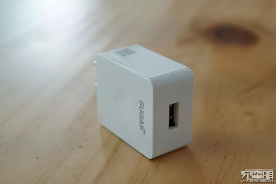 附送的充电器为白色,USB-A输出口,印有“SUGAR LADY”品牌标识。