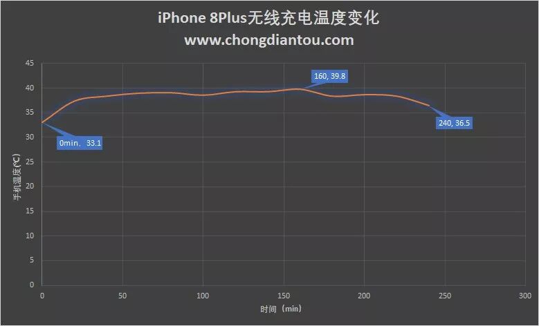 上图为iPhone 8Plus无线充电时的温度变化,可以看出,整次充电,iPhone 8Plus的温度在35.9℃~39.8℃之间徘徊,使用FLIR测温仪测得在充电160分钟时(2小时40分钟)温度达到39.8℃。在第240分钟(4小时)测得温度为36.5℃。