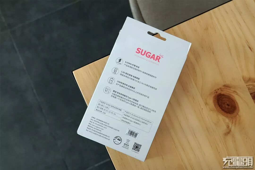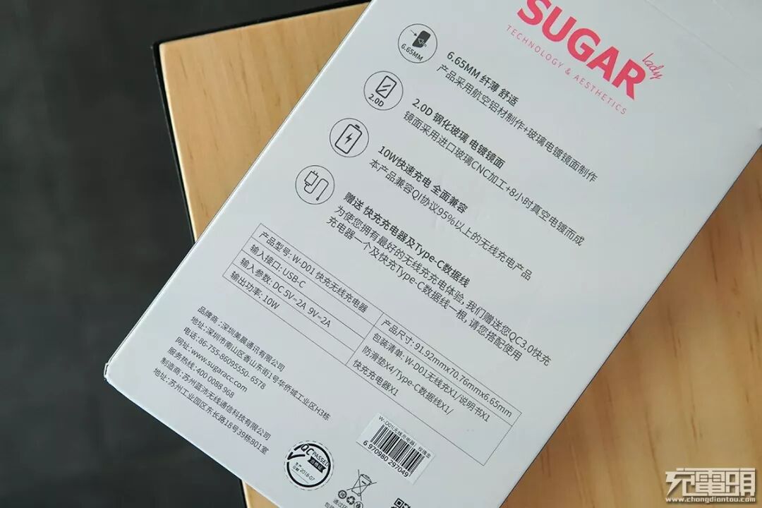 包装背面则印有产品的4大特性:6.55mm纤薄、电镀镜面、兼容95%以上的Qi协议设备、赠送了QC 3.0充电器及Type-C数据线;以及无线充电器产品的相关参数。