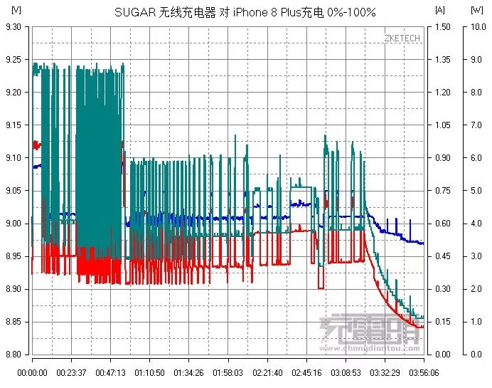 iPhone 8 Plus用尽电量到0%自然关机后,放到SUGAR LADY化妆镜无线充电器上面进行充电到100%,全程使用仪器监测绘制成曲线。蓝色曲线是电压红色曲线是电流,全程保持握手QC2.0 9V,绿色是功率曲线,开始50分钟以最大功率进行充电,之后功率回落到直到3小时15分后电流逐渐减少至充满,全程耗时3小时56分。