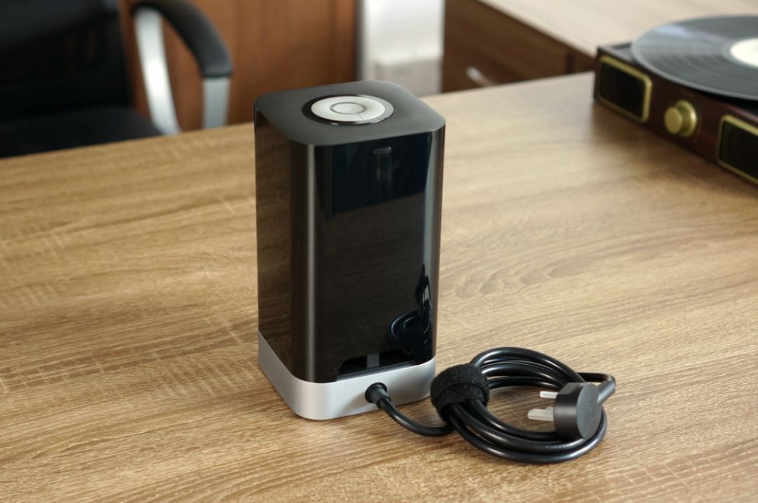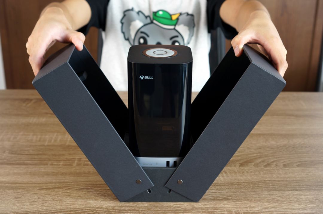 打开包装盒,里面就是公牛智立方USB插座(WiFi版),看起来完全不像插座,更像一个小音箱。插座主题呈黑色,又不是全黑,黑中略带透明,可隐约看到内部,宛如穿黑裙的赫本。