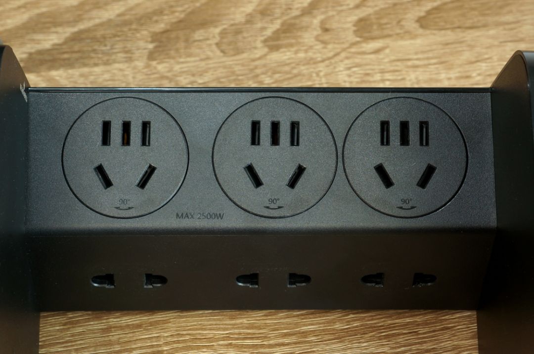 5脚插孔和2脚插孔所在面呈一定的角度,用户一眼就能将两个面一览无余,插拔时更加方便,设计非常人性化。仔细看,每个5脚插孔上都有标有“90°”字样,这个主要是为了调整插头角度以达到更方便地收纳电源线的目的而设计的,可参考下面的动图。