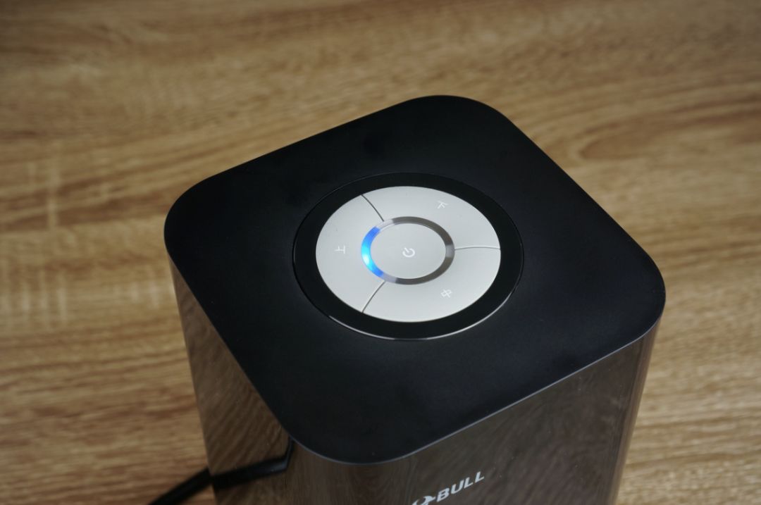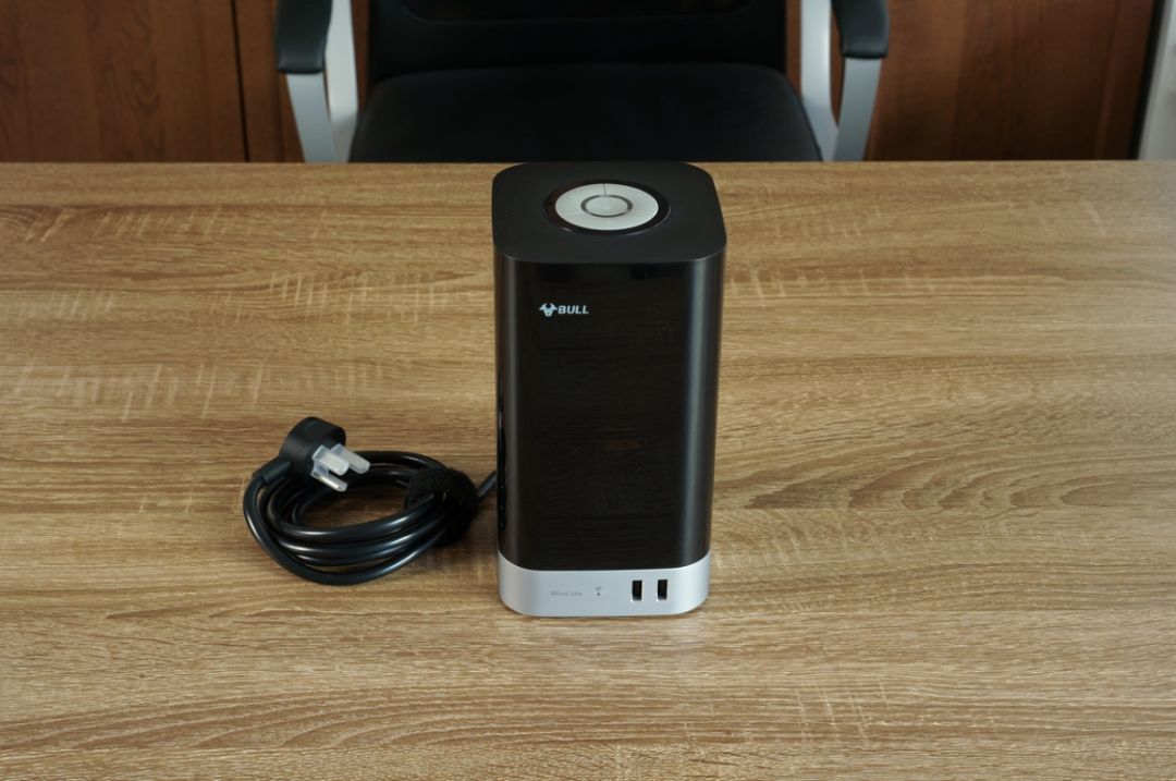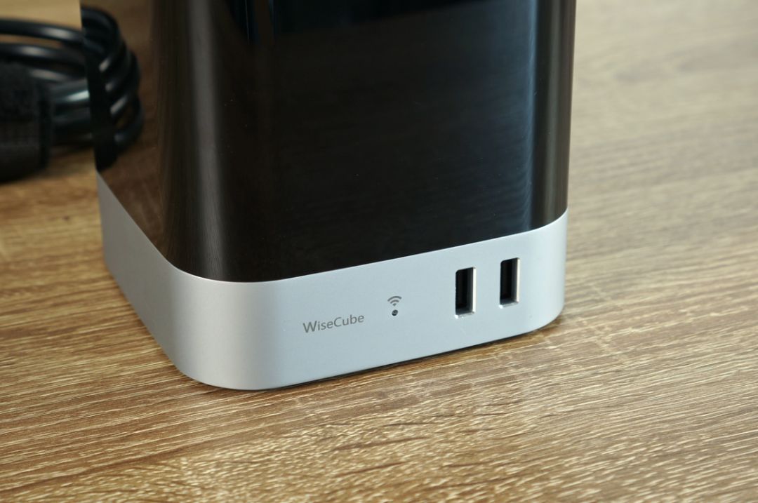 左上角是公牛的品牌标志, 左下方银色部位是“WiseCube”智立方的英文名,往右边是WiFi指示灯,通电状态下为红色,WiFi连接状态下为蓝色,红蓝交替闪烁为出厂默认状态,配置手机连接时为粉色状态。另外还配备了两个USB输出口可给手机、手环等设备充电,单口最大输出可达5V/2.4A。