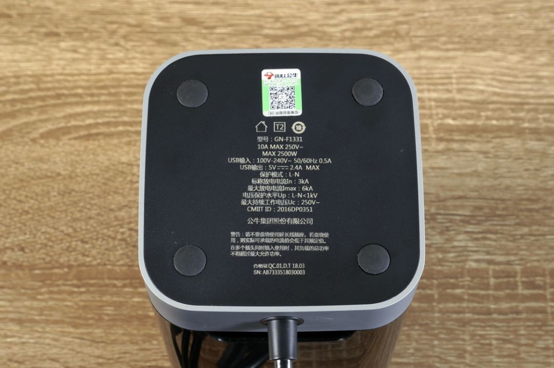 底部标注了产品的详细规格参数还有公牛的防伪二维码。产品型号:GN-F1331,承载功率250V/10A/2500W,USB输出5V/2.4AMax,公牛集团股份有限公司出品。看到这里大家或许要心生疑问了,这个插座插孔都没有该如何使用呢?