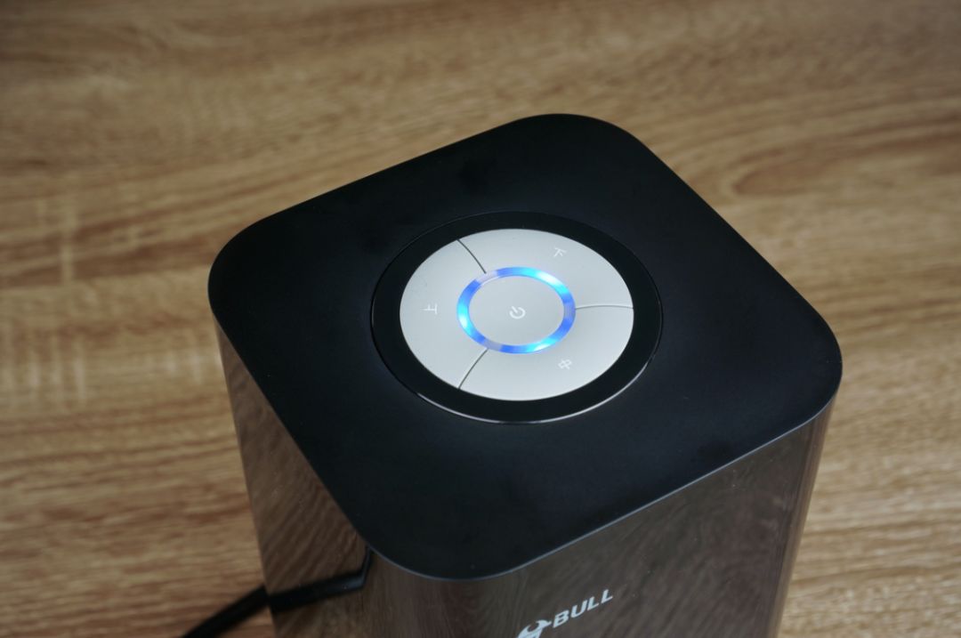 顶部是四颗实体橡胶按键,手感柔软舒适。中间是插座总开关,边上三颗按键分别写有“上”、“中”、“下”字样。