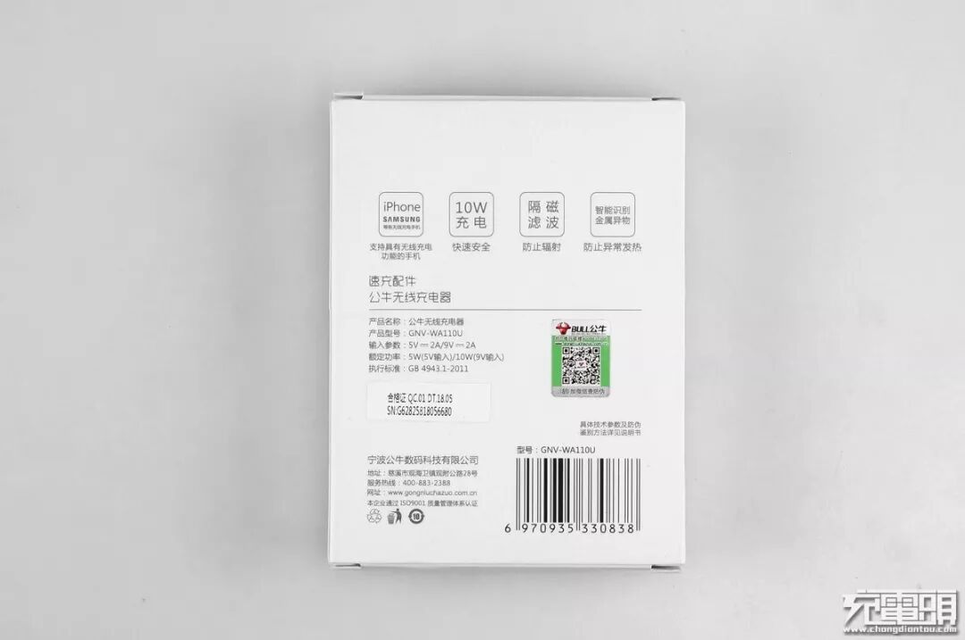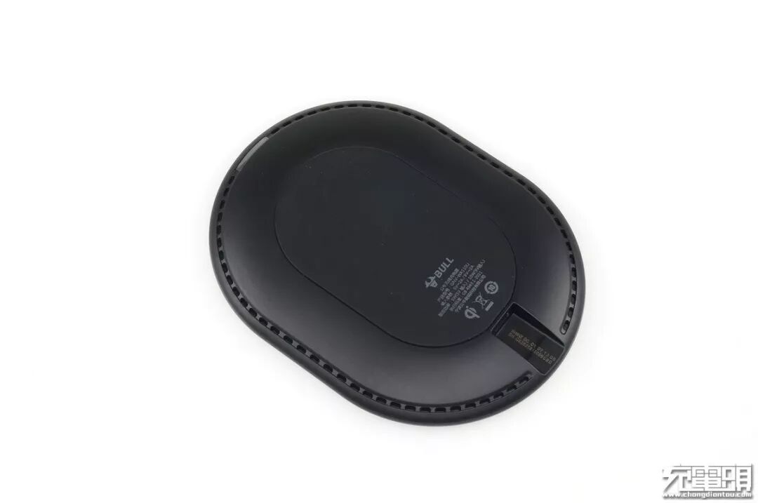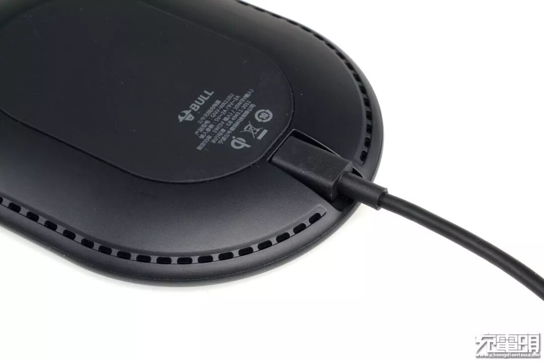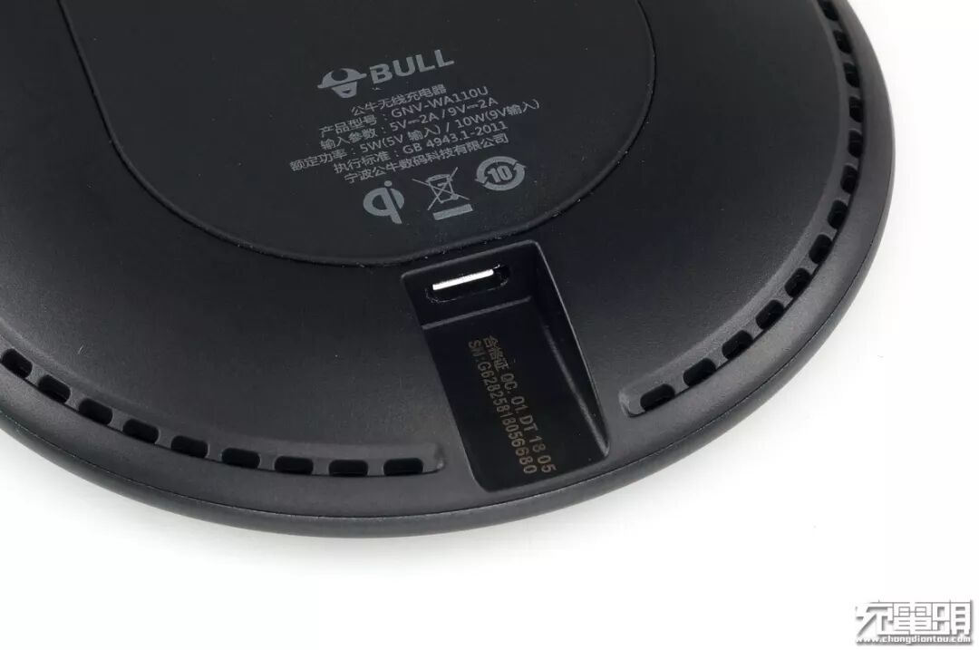 边缘布满散热孔,对流置换带走无线充电器内部热量,细节考虑比较周到。公牛无线充电器使用了MicroUSB接口作为输入接口。防滑垫上是铭牌信息,具体如下: