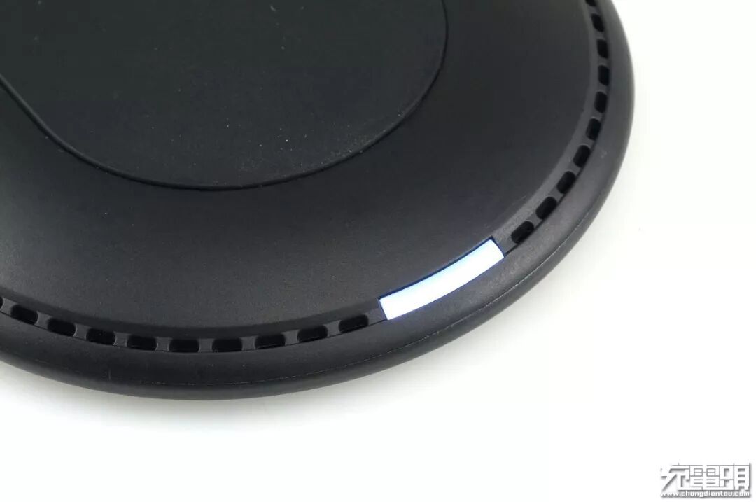 公牛无线充电器前方底部带有一颗白色指示灯,通电瞬间闪烁三次,而后熄灭进入待机状态。待机状态下指示灯不亮起,正常充电过程中指示灯长亮,检测到金属异物等充电异常时指示灯闪烁以提示用户,非常人性化。