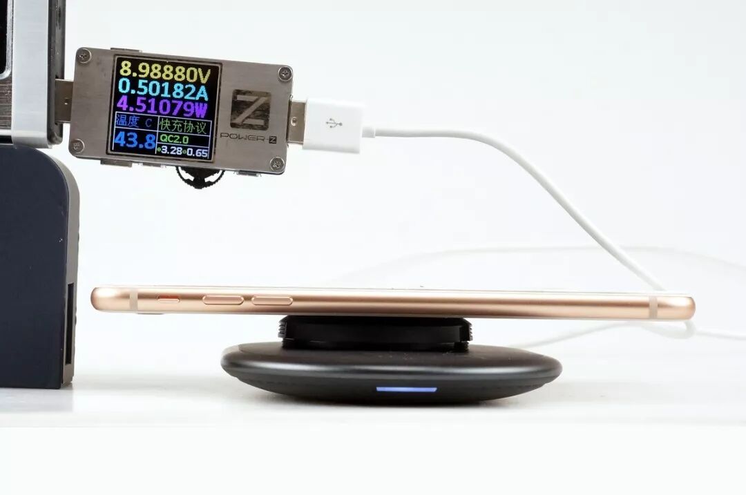 上图中,小编在公牛无线充电与iPhone8Plus之间放置一个高约9mm的相机镜头盖,手机依然能够正常充电,只是充电效率有所下降。比宣称的6mm还要高出不少。所以,使用GNV-WA110U无线充电器,只要你的保护套在手机线圈位置没有金属物品,就不会影响充电功能。
