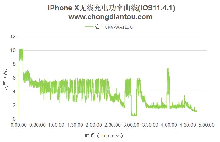 首先,我们先测试一下公牛无线充电器对iPhone X的充电,测试在室温28℃中进行,测试采集0%-100%充电全程的功率数据,绘制成图表如上。从图标中可以看到,充电器端的最大输入功率可以达到10W,考虑到手机接收端的效率一般在70%~78%左右,即此时iPhoneX的充电功率约为7.5W,符合宣称的7.5W。整个充电过程的平均功率在5W左右。