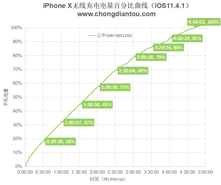 绘制成手机电量百分比曲线如上图所示,从图表可知,半小时可充入18%,1个小时充入32%,全程耗时4小时43分。