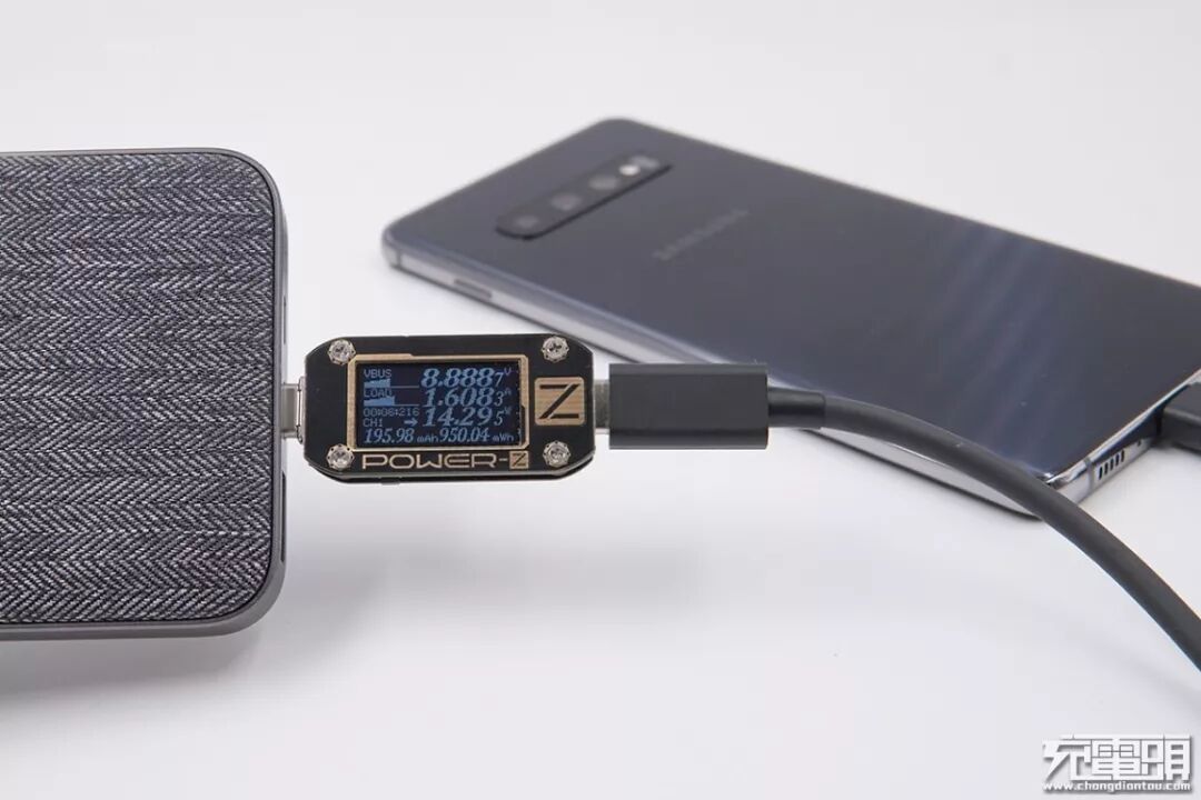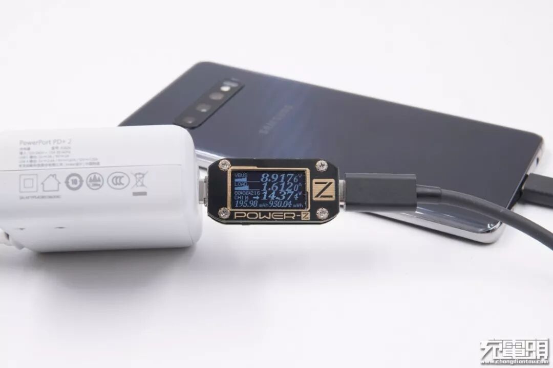 ANKER(A2626)充电器,双输出口(一个USB-C、一个USB-A),USB-C口功率18W,支持PD快充协议,充三星S10+,电压8.91V,电流1.61A,功率14.37W,开启PD快充。
