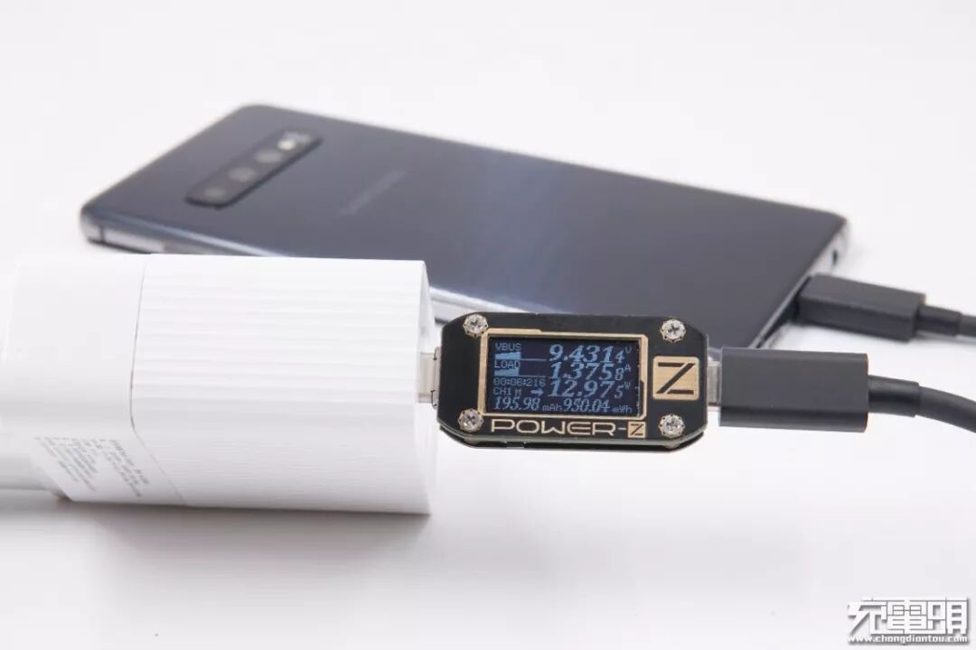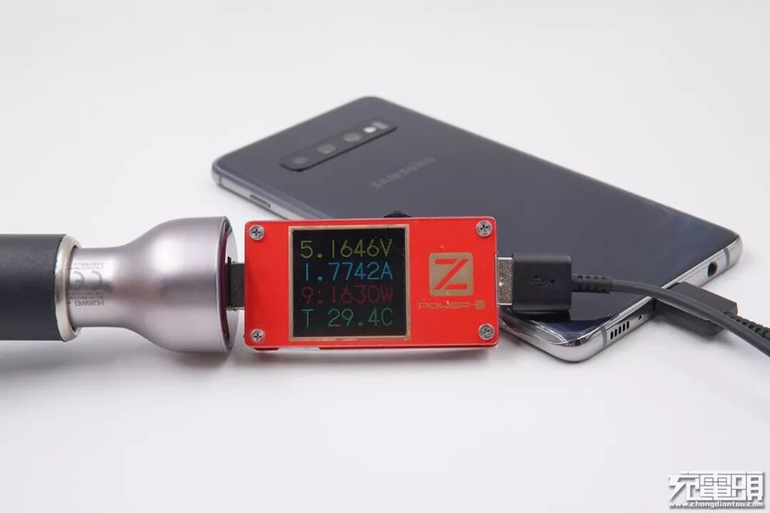 HUAWEI华为(HW-200325CP0)充电器,功率65W,支持PD快充,充三星S10+,电压9.15V,电流1.41A,功率12.98W,开启PD快充。