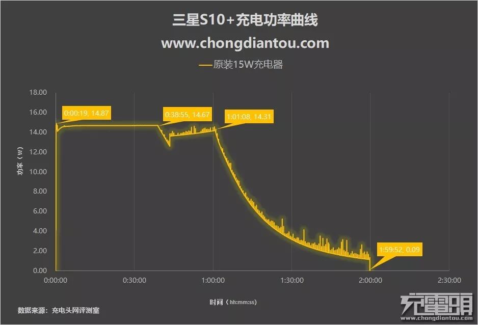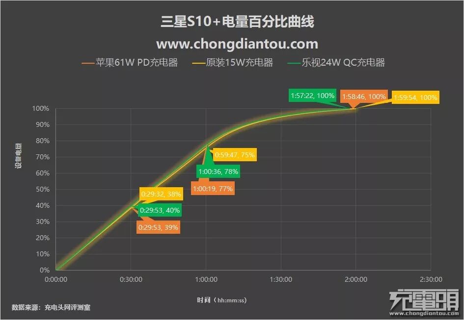 全程耗时:三星S10+原装充电器1小时59分钟,苹果61W PD充电器1小时58分钟,乐视24W QC充电器1小时57分钟。
