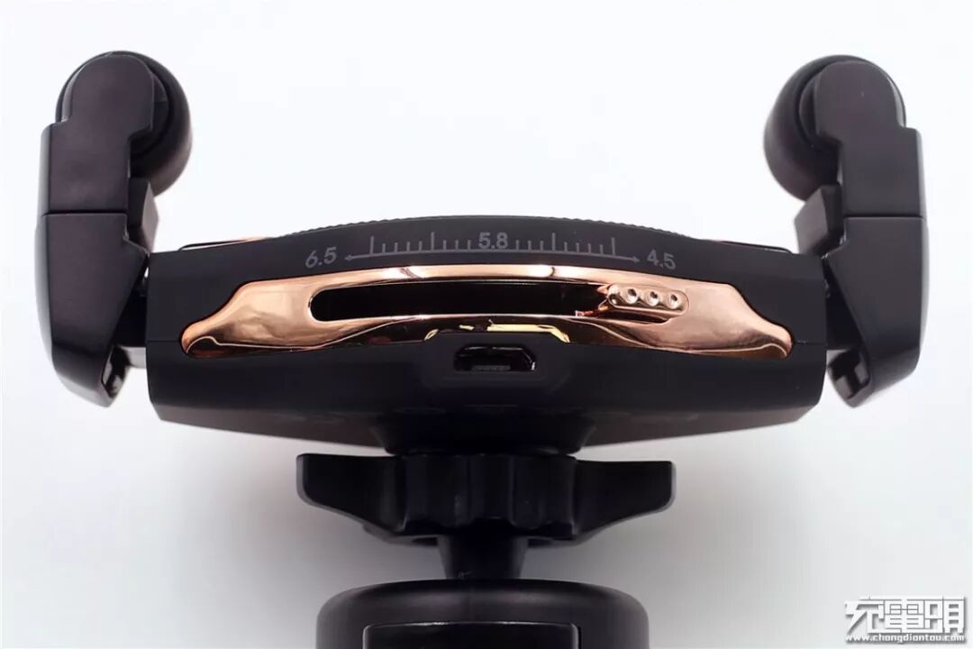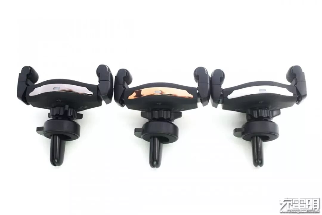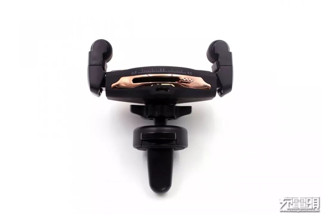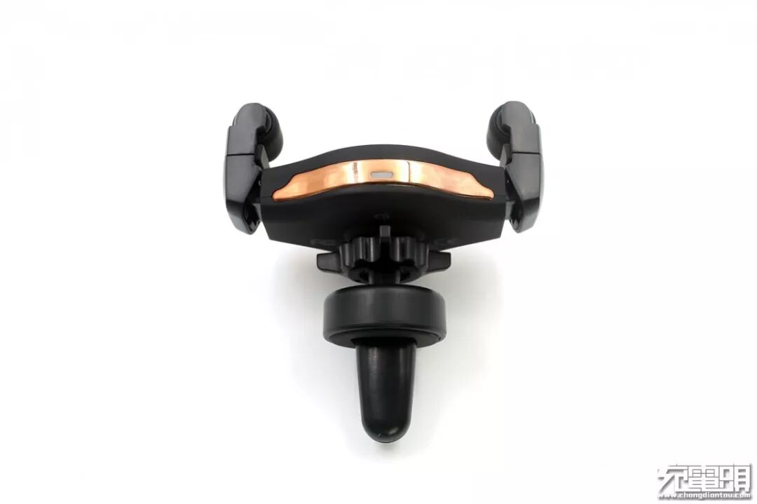 上半部分正面有一枚指示灯,接通电源后指示灯亮蓝色光,给手机充电时亮红色光;硅胶滚轮夹臂分居两侧,内部有弹簧,夹臂可以摆动,对手机施加适当的加持力。