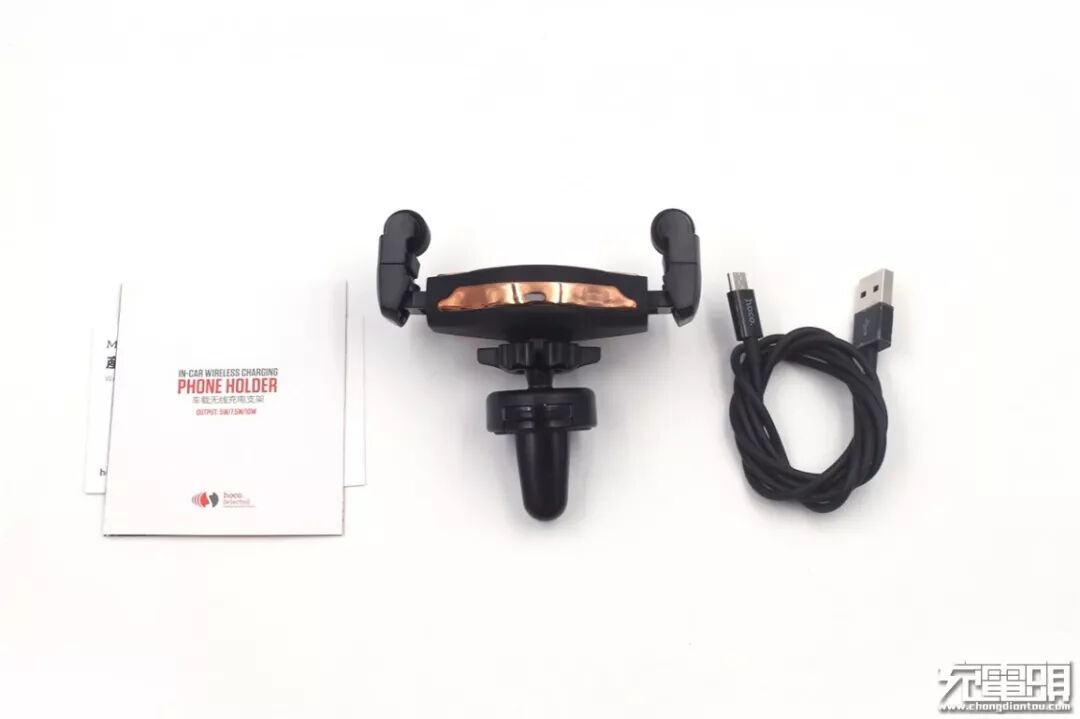 全部物品一览:说明书、车载无线充电支架、数据线。