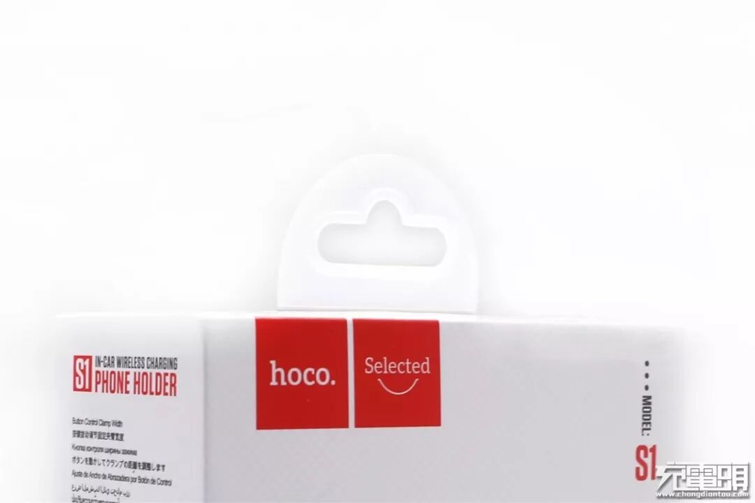 正面彩印浩酷S1图样,可以直接看到产品样貌,消费者能够很好的了解到包装内物品的外观。左上角和右下角印有“hoco.Selected”,是浩酷开设的全新的产品系列,意为浩酷精选产品。右上角还标注了产品的型号:S1,底部还有“qi”的标识,意思是这款车载支架支持“qi”无线充电标准。